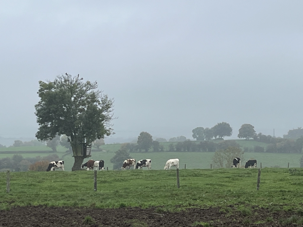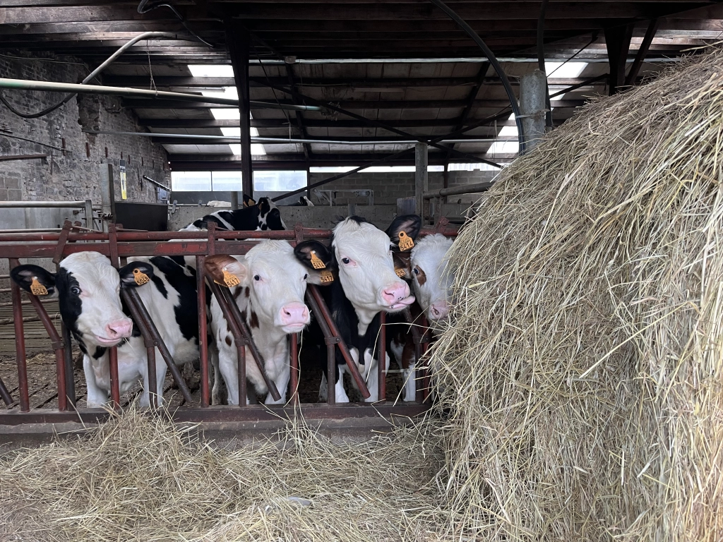 La ferme compte près de 70 vaches (Holstein et Montbéliardes), réparties sur 60 hectares de prairies, dont 40 hectares de pâturage directement accessibles depuis l’étable. Les vaches pâturent dès le mois de mars, passent les nuits dehors à partir de mai et rentrent progressivement à l’intérieur à l’automne. Leur alimentation repose principalement sur l’herbe des pâturages, complétée par du tourteau de La SCAR (Herve) et, ponctuellement, du maïs bio de Warsage. Les naissances ont lieu toute l’année, sans planification.