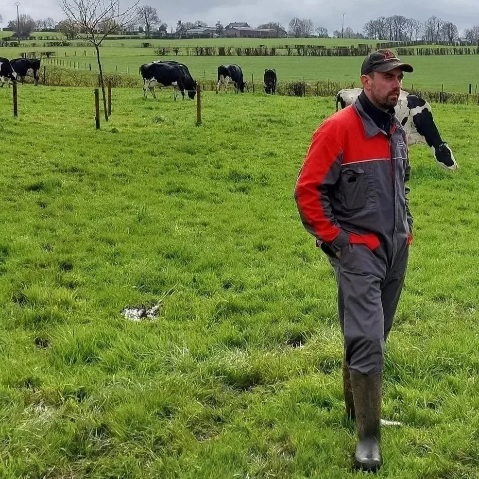 Il travaille exclusivement avec du lait de vache cru et bio. Pour cela, il collabore avec un producteur de confiance : Michaël Gilliquet, qui possède une petite ferme biologique spécialisée dans le lait de foin à Aubel. Les vaches y sont nourries principalement à l’herbe fraîche et au foin, sans aliments fermentés. Ce mode d’alimentation garantit un lait plus aromatique, plus stable et plus respectueux de l’environnement.
